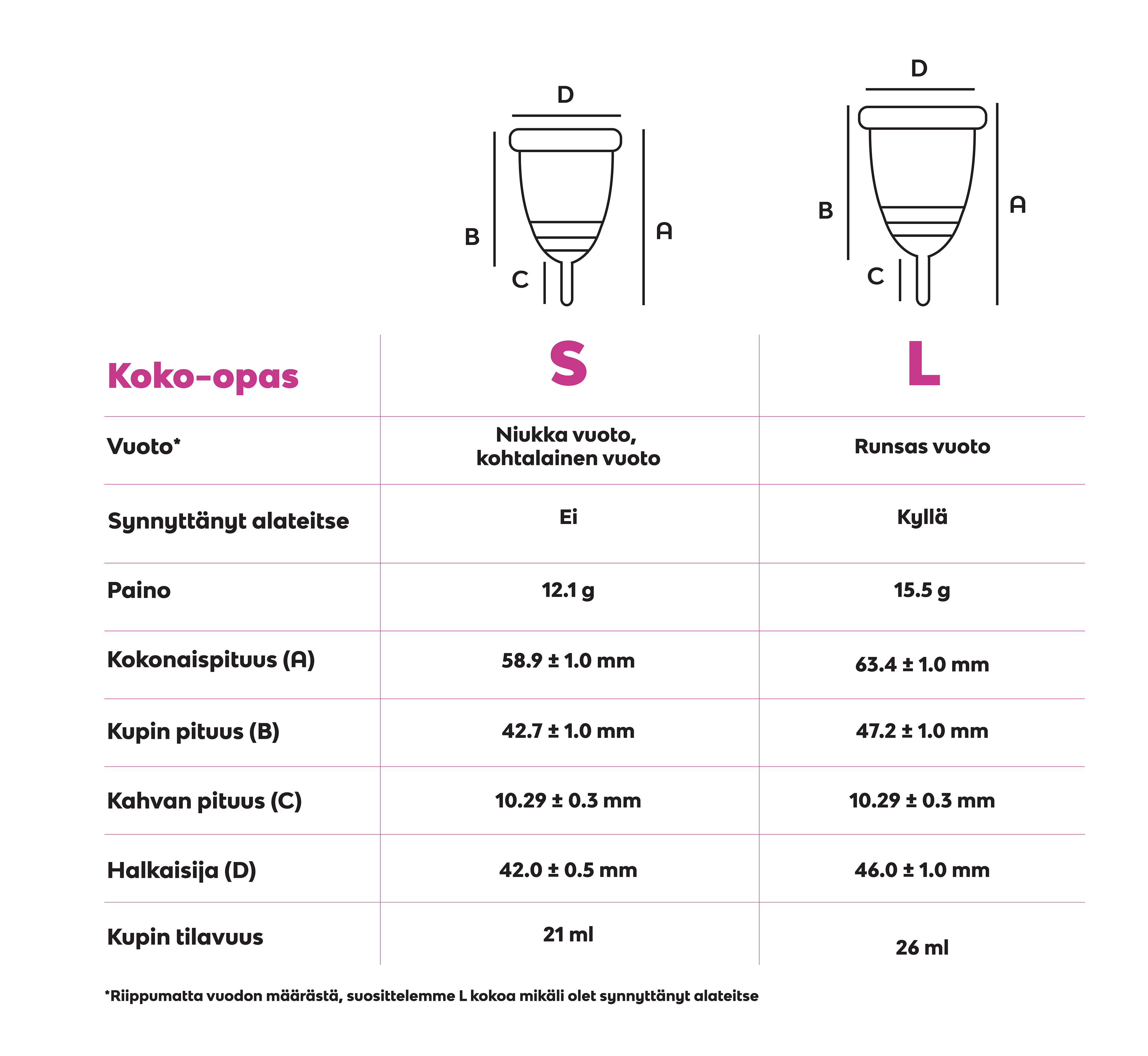 Libresse V-Cupista on saatavana kaksi eri kokoa: S ja L - tarkista, kumpi sinulle sopii koko-oppaaseemme.